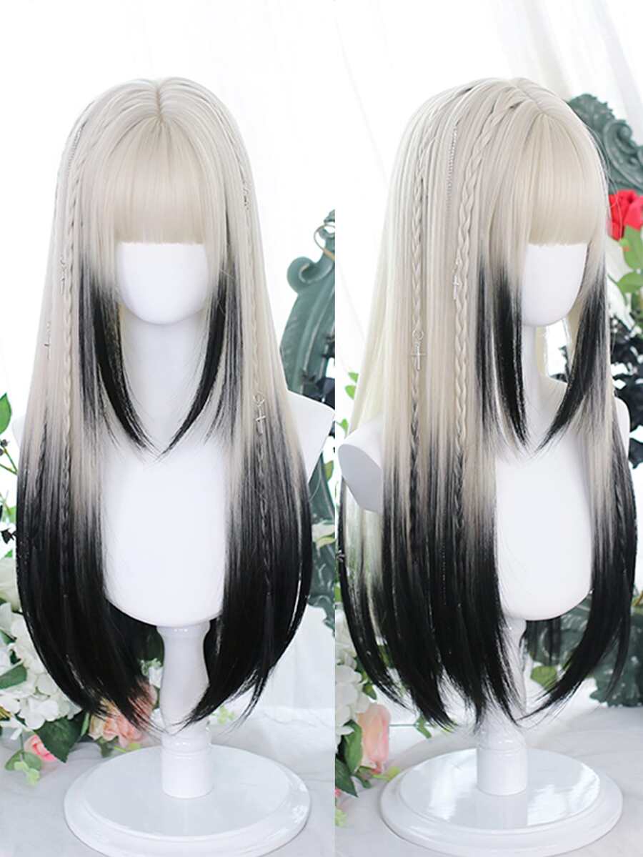 synthetic long straight hair women's wig silver gradient black wig cosplay lolita bangs wig party wig